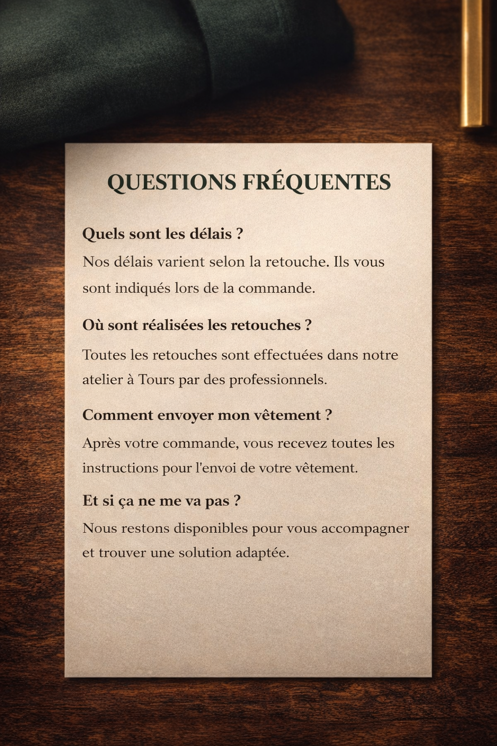 Depuis l’atelier, chaque vêtement est ajusté, réparé ou transformé avec le même soin que si vous étiez directement en boutique.