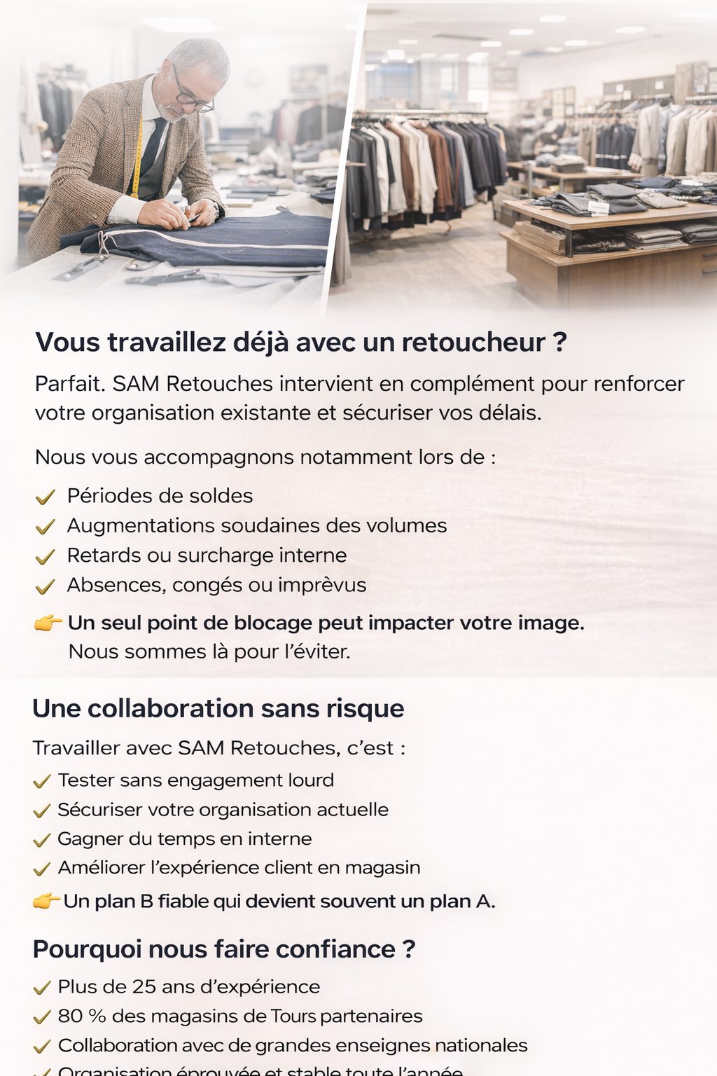 Chez SAM Retouches, nous accompagnons les professionnels pour sécuriser les délais, absorber les pics d’activité et garantir la satisfaction client, sans alourdir votre organisation.